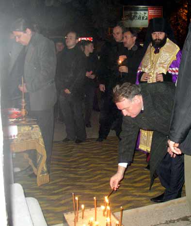 На фото: голова Ради міністрів АРК Анатолій Бурдюгов запалює поминальну свічку перед молебнем біля храму святих Володимира та Ольги УПЦ КП у Сімферополі. Тут поминальних заходів вже ніхто, дякувати Богу, не зривав... Фото В. РУДЕНСЬКОГО.