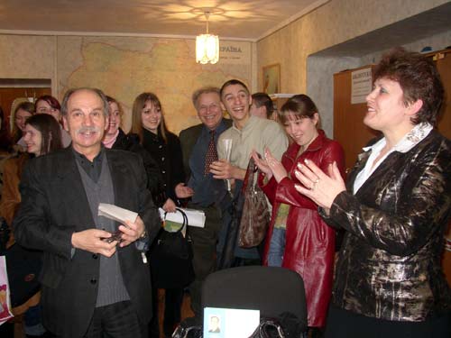 На фото: пан╕ Л╕д╕я Щербачук (праворуч) т╕льки-но дов╕далася, що саме заповнений нею абонемент став 4-тисячним! Данило Кононенко божиться, що адм╕нресурс тут н╕ при ч╕м... Фото В. КАЧУЛИ. АНОНС!