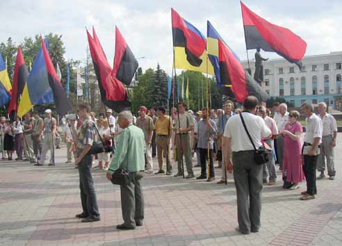 Невдовз╕ п╕сля свята укра╖нсько╖ Конституц╕╖, Конгрес укра╖нських нац╕онал╕ст╕в Криму нагадав нам ще про одну р╕чницю: 65 рок╕в тому 30 червня 1941 року у Львов╕ було проголошено Укра╖нську суверенну державу. За с╕м годин до входу у Льв╕в г╕тлер╕вських в╕йськ на зах╕дних землях запанувала укра╖нська влада, яку принесли сюди повстанц╕ п╕д проводом Степана Бандери. ╤ хоча тема ця в Криму, м'яко кажучи, не дуже популярна, але ж "з перших уст" ознайомитися з протилежним поглядом на нашу ╕стор╕ю кримчанам теж було б не зайвим. Щоправда, тут розраховувати доводиться лише на ЗМ╤, бо масовост╕ на площ╕ Лен╕на в С╕мферопол╕, де все ╕ в╕дбувалося, цього спекотного дня не спостер╕галося. Та й представники КУНу, що мали з'╖хатися з усього Криму, далеко не вс╕ зд╕йснили цей нам╕р. ╤нша справа - гост╕ з материково╖ Укра╖ни: Льв╕вщини, Р╕вненщини, Ки╓ва. Це люди, як╕ не в╕дчувають незручност╕ в╕д того, що успадкували погляди сво╖х батьк╕в та д╕д╕в, котр╕ готов╕ були в╕ддати життя (╕ в╕ддавали!) за волю Укра╖ни. Льв╕вщину представляв головний редактор газети "Заграва" Микола Магас. В особист╕й розмов╕ в╕н розпов╕в, що газета ця виходить раз на м╕сяць ╕ готу╓ться на громадських засадах, тому ╓ ц╕лковито незалежною. Вона - ультраправого спрямування. - Жодна газета в Криму не надруку╓ того, що друку╓мо ми. Але, щоб був центр, мусить бути ╕ правий фланг, - пояснив редактор. Те, що ця людина безкомпром╕сна, можна було зрозум╕ти ╕ з його виступу на м╕тингу: - От би поставити наших депутат╕в, що н╕як не под╕лять портфел╕, п╕д дула автомат╕в, - забажав в╕н, проводячи паралель м╕ж героями Укра╖ни (це про них йдеться у прив╕танн╕: "Слава Укра╖н╕!" "Героям слава!") ╕ нашими матер╕ально захищеними обранцями, що в розпал╕ амб╕ц╕й та користолюбства ╕нод╕ зовс╕м забувають про депутатськ╕ обов'язки. Сво╓ невдоволення нин╕шньою владою не приховував ╕ сп╕вак-бандурист з Ки╓ва Василь Лютий. - Хто ╓ радниками Президента? Пасхавер, Н╓мцов... Хто вони для Укра╖ни? Укра╖ну буду робити я. Я тут господар, а не Бродський, Порошенко, Тимошенко... ╤ м╕сце тут буде кожному, хто шануватиме укра╖нськ╕ закони. Але сьогодн╕ обира╓мо не ми, а т╕, хто платить грош╕. Ми повернемо соб╕ це право, - темпераментно промовляв в╕н. Але ще б╕льше сказали п╕сн╕ Василя п╕д бандуру. На площ╕ прозвучали також г╕мни Укра╖ни та КУНу. А молодий кримчанин Олександр Насоненко висловив побажання, щоб площа Лен╕на незабаром була перейменована на площу Симона Петлюри чи Степана Бандери. До реч╕, 30 червня укра╖нськ╕ нац╕онал╕сти святкували ще одну дату - 16-ту р╕чницю з дня створення УНА-УНСО. На м╕тингу йшлося про те, що лише под╕бн╕ сили здатн╕ повести народ "в б╕й за укра╖нську Укра╖ну". Виступаюч╕ дали доброго прочухана рос╕йським шов╕н╕стам та тим, хто намага╓ться поставити на кол╕на нашу державу з допомогою економ╕чного тиску. Пут╕на, вт╕м, пом`янули позитивно за його указ щодо повернення на батьк╕вщину сп╕вв╕тчизник╕в, що опинилися за ╖╖ межами внасл╕док пол╕тики минулих час╕в. Аналог╕чного р╕шення нац╕онал╕сти оч╕кують ╕ в╕д власного Президента. Резолюц╕я м╕тингу, в╕ддрукована накладом 50 000 прим╕рник╕в, разом з╕ зверненням до рос╕йськомовних громадян поширювалася в п╕дземному переход╕. На╖вно спод╕ватися, що це звернення 
