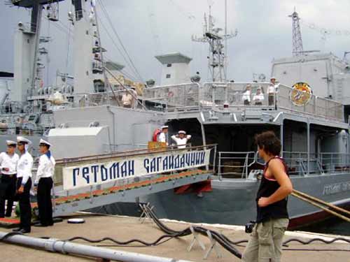 Щоб зрозум╕ти морськ╕ простори, не обов’язково день за днем проводити на пляж╕. Можна взяти участь у акц╕╖ «Гетьман Сагайдачний: корабель та людина» ╕ побувати на сторожовому корабл╕ з однойменною назвою. З нагоди тринадцятир╕ччя спуску на воду в╕йськового корабля «Гетьман Сагайдачний» 14 липня на його борту проходив 3-й раунд Всекримського турн╕ру з укра╖нського морського бою. В програм╕ заходу був зазначений не т╕льки турн╕р. Першим на черз╕ стояло знайомство з командуванням головного корабля ВМС Укра╖ни та його ек╕пажем. П╕сля звичного «р╕вняйсь!» - «струнко!» ╕ допов╕д╕ про виконання шикування в╕дбулася прес-конференц╕я з Антоном Геруновим, кап╕таном 3-го рангу. Стало зрозум╕ло, що «Гетьман Сагайдачний» не випадково був обраний орган╕заторами для проведення турн╕ру. В╕н ма╓ ╕стор╕ю, котрою може пишатися не кожний. Сторожовий корабель «Гетьман Сагайдачний» проекту 1135.1 першим п╕дняв прапор ВМС Укра╖ни – це в╕дбулося 4 липня 1993 року. В 1994 роц╕, вийшовши з Севастополя, флагман взяв курс на Франц╕ю. Йому була доручена честь взяти участь у святкуванн╕ 50-╖ р╕чниц╕ висадки союзних в╕йськ у Норманд╕╖. Ек╕паж в╕дпрацював десятки завдань, плавання стало гарною школою вдосконалення практичних навичок у застосуванн╕ техн╕ки ╕ озбро╓ння. Другий далекий морський пох╕д корабель зд╕йснив восени 1995 року, пришвартувавшись у Абу-Даб╕. Там проходила виставка збро╖ «Айдекс–95», де Укра╖на була представлена окремим пав╕льйоном. 1 серпня 1996 року в╕дбулися перш╕ в ╕стор╕╖ флоту навчання корабельних з’╓днань морсько╖ ав╕ац╕╖ ╕ в╕йськ берегово╖ оборони. Завершальний етап маневр╕в пройшов п╕д прапором верховного головнокомандуючого Збройними Силами Президента Укра╖ни Л. Кучми, який знаходився на «Гетьман╕ Сагайдачному». Зараз же цей флагман буде брати активну участь в операц╕╖ «Активн╕ зусилля» – у 2007 роц╕ плану╓ться зд╕йснити пох╕д у Чорне море для виконання завдань сп╕льно з кораблями ╕нших держав. У склад╕ з’╓днання в╕йськову службу проходять представники вс╕х областей Укра╖ни. Серед них ╓ ╕ кримськ╕ татари, ╕ молдавани, ╕ румуни, ╕ н╕мц╕, ╕ узбеки, ╕ угорц╕. На в╕дм╕ну в╕д ж╕нки, перебування на корабл╕ тварин не ╓ трагед╕╓ю. Зг╕дно з корабельним статутом, на фрегат можна брати «брат╕в наших менших» при умов╕, що вони забезпечен╕ пров╕антом ╕ з ними чемно поводяться. В╕дом╕ випадки, коли при швартуванн╕ корабля першим на землю виходив пес. До реч╕, дозв╕л на перебування тварини п╕дтверджу╓ присутн╕сть кошеняти на корабл╕. Руде чудо зовс╕м не бо╖ться сторонн╕х ╕ з насолодою умощу╓ться на кол╕нах гостей. Коли конференц╕я зак╕нчилася, гостям було запропоновано розд╕литися, щоб не гаяти часу. Одна половина зосталася, щоб взяти участь у турн╕р╕. Серед них були як люди, що отримали перемогу в перших двох раундах, так ╕ т╕, котрим просто забажалося згадати дитинство. До того ж, було б шкода пропустити можлив╕сть з╕грати з такими незвичайними супротивниками – командою «Гетьмана Сагайдачного». Ц╕каво було бачити в очах матрос╕в – людей, котр╕ повинн╕ весь час тримати себе у рамках ╕ вести себе зг╕дно з╕ статутом, - справжн╕ ╕скорки запалу. За результатами цього туру переможницею стала Л╕ля Буджурова, головний редактор «Першо╖ кримсько╖». Вона та ще й т╕, хто пос