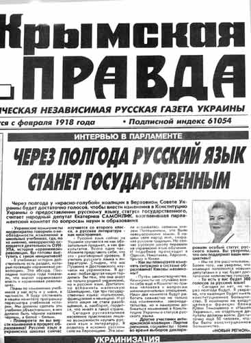 ЖОДНИХ СПЕКУЛЯЦ╤Й ЩОДО ДЕРЖАВНОГО СТАТУСУ УКРА╥НСЬКО╥ МОВИ НЕ МОЖЕ БУТИ! Мова - це основа нац╕онально╖ ╕дентичност╕, запорука ╓дност╕ укра╖нського народу й держави. Президент Укра╖ни ч╕тко висловив свою позиц╕ю щодо укра╖нсько╖ мови як ╓дино╖ державно╖. Це п╕дтримано й пров╕дними пол╕тичними силами кра╖ни в п╕дписаному Ун╕версал╕. На цьому наголосив 1 вересня глава Секретар╕ату Президента Олег Рибачук, в╕таючи студент╕в та викладач╕в ╤нституту ф╕лолог╕╖ Ки╖вського нац╕онального ун╕верситету ╕мен╕ Тараса Шевченка ╕з першовересневим святом, пов╕домля╓ Укр╕нформ ╕з посиланням на оф╕ц╕йне ╕нтернет-представництво глави держави. За словами кер╕вника Секретар╕ату, такими п╕дходами керуватимуться ╕ в╕дпов╕дно сформован╕ органи державно╖ влади. В╕н висловив переконання, що «жодних спекуляц╕й щодо державного статусу укра╖нсько╖ мови не може бути». Олег Рибачук порушив також тему свободи преси. На його думку, в╕льне слово - це одна з найважлив╕ших ц╕нностей в Укра╖н╕, оск╕льки ╓ найпотужн╕шим ╕нструментом боротьби з несправедлив╕стю та нечесн╕стю. Як зазначив кер╕вник Секретар╕ату, «спробам тиску, залякування та ф╕зично╖ розправи з журнал╕стами буде дана в╕дс╕ч. Влада ╕ Глава держави особисто контролюватиме цю ситуац╕ю». Олег Рибачук висловив спод╕вання, що студенти п╕сля зак╕нчення ун╕верситету стануть не лише фах╕вцями, але й нац╕онально св╕домими профес╕оналами, додавши: «Я пишаюся тим, що ╓ випускником цього закладу, й бажаю великих звершень на вашому профес╕йному шляху». ПРЯМА МОВА «Через полгода у «красно-голубой» коалиции в Верховном Совете Украины будет достаточно голосов, чтобы внести изменения в Конституцию Украины о предоставлении русскому языку статуса государственного, считает народный депутат Екатерина САМОЙЛИК (фракц╕я комун╕ст╕в - ред.), возглавившая парламентский комитет по вопросам науки и образования...». «Я уверена, что коалиция будет иметь конституционное большинство. В коалицию не войдут целиком фракции блока Юлии Тимошенко и «Нашей Украины», но отдельные депутаты должны войти. Достаточно еще 50 человек, чтобы было конституционное большинство». «Крымская правда», 20.07. 2006 р.