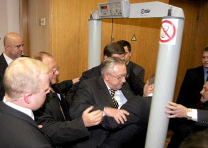 Парламентська фракц╕я «Нашо╖ Укра╖ни» загрожу╓ ╕н╕ц╕ювати в╕дставку Кабм╕ну за системн╕ порушення закону ╕ через ситуац╕ю, що склалася навколо м╕н╕стра закордонних справ Бориса Тарасюка. Представник НУ, народний депутат В`ячеслав Кириленко сказав, що його пол╕тсила буде «жорстко реагувати на под╕бн╕ д╕╖ «антикризовик╕в», звертатися в судов╕ ╕нстанц╕╖. Але пол╕тичним насл╕дком тако╖ зневаги повинна стати в╕дставка всього Каб╕нету М╕н╕стр╕в, «╕ це неминуче». За словами Кириленка, до уряду ╓ багато претенз╕й, починаючи з бюджету ╕ зак╕нчуючи кадровою пол╕тикою. Депутат п╕дкреслив, що невиконання указ╕в Президента ╕ нав╕ть тих норм, як╕ передбачен╕ новою редакц╕╓ю Конституц╕╖, ставлять д╕ючий уряд поза законом. Нагада╓мо, що, за Конституц╕╓ю, реал╕зац╕я зовн╕шньо╖ пол╕тики ╓ прерогативою Президента, як ╕ визначення кандидатури глави МЗС, в╕дставка якого може в╕дбутися т╕льки за поданням Президента. Цього тижня Каб╕нет М╕н╕стр╕в Укра╖ни звернувся до Президента ╕ Верховно╖ Ради з проханням призначити тимчасово виконуючого обов’язки м╕н╕стра закордонних справ Укра╖ни. У такий спос╕б Каб╕нет В╕ктора Януковича в╕дреагував на вже другий ╕нцидент з недопущенням Бориса Тарасюка на зас╕дання Кабм╕ну. Прем’╓р висунув ультиматум: якщо Президент не визначиться з кандидатурою тимчасово виконуючого обов’язки глави МЗС, це буде зроблене парламентом. ПРЕЗИДЕНТ НАПОЛЯГА╢, ЩО М╤Н╤СТРОМ ЗАКОРДОННИХ СПРАВ УКРА╥НИ ЗАЛИША╢ТЬСЯ БОРИС ТАРАСЮК Президент Укра╖ни В╕ктор Ющенко в╕дхилив ╕н╕ц╕ативи Прем’╓р-м╕н╕стра Укра╖ни В╕ктора Януковича щодо зам╕ни Бориса Тарасюка на посад╕ м╕н╕стра закордонних справ. Про це глава держави заявив на прес-конференц╕╖ для заруб╕жних ЗМ╤. «М╕н╕стром закордонних справ Укра╖ни працю╓ Тарасюк Борис ╤ванович. Це фундаментальна, базова позиц╕я Президента в цьому питанн╕. Я в╕дхилив ╕н╕ц╕ативи Прем`╓р-м╕н╕стра про зам╕ну ц╕╓╖ кандидатури», - сказав В. Ющенко. Президент Укра╖ни зазначив, що не визна╓ прийняту Верховною Радою постанову про в╕дставку Б. Тарасюка. «Це в╕дставка не правова. Я ╖╖ не визнаю. Будь-який правознавець вам скаже, що якщо кандидатуру на затвердження глави МЗС до парламенту вносить Президент, то в╕н ╕ ╕н╕ц╕ю╓ в╕дставку цього м╕н╕стра», - пояснив в╕н. Як пов╕домляв Укр╕нформ, Верховна Рада Укра╖ни 1 грудня прийняла постанову про зв╕льнення Б. Тарасюка з посади м╕н╕стра закордонних справ, 5 грудня Шевченк╕вський районний суд Ки╓ва призупинив д╕ю постанови. Цього ж дня Президент Укра╖ни п╕дписав Указ про продовження виконання Б. Тарасюком обов’язк╕в м╕н╕стра закордонних справ. На фото: Бориса Тарасюка не пускають на зас╕дання Кабм╕ну.