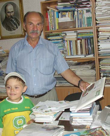 На фото: Данило Андр╕йович Кононенко з внуком Данилком в редакц╕╖ «Св╕тлиц╕». Фото В. КАЧУЛИ.