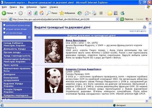 ТИМ ЧАСОМ... Укра╖нським урядом вже фактично «легал╕зовано» пров╕дника ОУН Степана Бандеру! Головна стор╕нка оф╕ц╕йного сайту Каб╕нету М╕н╕стр╕в Укра╖ни (http://www.kmu.gov.ua) в╕дкрива╓ться рубрикою «Видатн╕ державн╕ та громадськ╕ д╕яч╕». Другим у списку, п╕сля дочки Ярослава Мудрого французько╖ королеви Анни Ярославни, представлений Степан Бандера (див. репродукц╕ю). Фото супроводжу╓ться таким текстом: