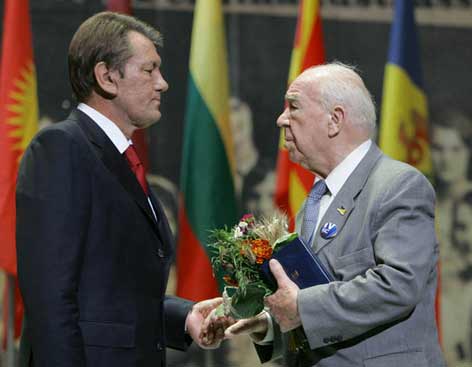 На фото: серпень 2006 року. Президент Укра╖ни вруча╓ ╢вгену Стах╕ву орден Ярослава Мудрого.