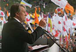 На завершення, шановн╕ виборц╕, я хочу сказати, що у нас все буде добре. Не ╓ проблема, що ми сьогодн╕ знаходимося в пол╕тичн╕й криз╕. Я переконаний, з ц╕╓╖ пол╕тично╖ кризи укра╖нська нац╕я, Укра╖нська держава вийде ще сильн╕шою ╕ ще кращою. Вибори будуть. Зм╕ни настануть ╕ перемога буде обов’язково за правдою, бо цього хочуть м╕льйони укра╖нських виборц╕в.