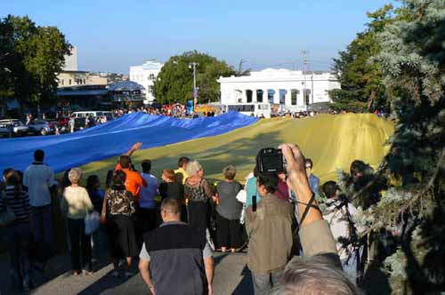 Наприк╕нц╕ вересня Севастополь приймав естафету розгортання найб╕льшого Прапора Укра╖ни, яку проводить Молод╕жний Союз "Наша Укра╖на". За словами Степана Барни, голови орган╕зац╕╖ та кер╕вника туру, який п╕сля старту в Донецьку про╖хав 18 областей, акц╕я спрямована проти спекуляц╕╖ пол╕тичних сил, як╕ намагаються под╕лити Укра╖ну, на доказ ╓дност╕ Сходу ╕ Заходу держави та любов╕ молод╕ до сво╓╖ Батьк╕вщини. Розгортати 100-к╕лограмовий прапор, який за тиждень роботи виготовила 68-р╕чна пенс╕онерка з Донецька Мар╕я Б╕лякова, ╕ який подорожу╓ м╕стами Укра╖ни, доводячи ╓дн╕сть Сходу ╕ Заходу держави, п╕д п╕сню "Люб╕ть Укра╖ну" на слова донеччанина Володимира Сосюри допомагали перехож╕ - м╕сцевий штаб помаранчевих не зм╕г орган╕зувати достатньо╖ к╕льк╕сно╖ п╕дтримки. Коли я запитав одного ╕з дуже високооплачуваних парт╕йних бонз, в╕дпов╕дального за аг╕тац╕йну роботу, чому на майдан╕ Нахимова в оч╕куванн╕ найб╕льшого Прапора Укра╖ни нема╓ н╕ музики, н╕ оркестру, н╕ укра╖нського хору, той в╕дпов╕в: "Це не моя справа" ╕ накивав п’ятами. Отако╖! А чия? Х╕ба неможливо було ╕з б╕льше н╕ж двох тисяч член╕в "Нашо╖ Укра╖ни" орган╕зувати к╕льк╕сну перевагу над журнал╕стами та м╕л╕ц╕онерами, як╕ охороняли громадський порядок на заход╕? Чи можна п╕сля тако╖ слабко╖ орган╕зац╕╖ розраховувати на позитивне висв╕тлення в прес╕, тим б╕льше в севастопольськ╕й? Аж ось за к╕лька хвилин прапор-рекордсмен розм╕ром 30 х 45 метр╕в розгорнуто. До цього найб╕льшим вважалось грецьке знамено площею 600 кв. метр╕в, а тепер орган╕затори планують потрапити до Книги рекорд╕в Г╕ннесса. Майдан Нахимова став виглядати весел╕ше ╕ по-укра╖нськи. Прапор хвилями п╕дн╕мають п╕д п╕сню УПА "Лента за лентою набо╖ подавай, вкра╖нський повстанче, в бою не в╕дступай!". Ще недавно це не могло наснитись у страшному сн╕ найб╕льш заляканим антиукра╖нською пропагандою севастопольцям. До десятка пол╕тично стурбованих негромадян виразили св╕й протест криками та виконанням п╕сн╕ з╕ словами "Я другой такой страны не знаю, где так вольно дышит человек". А й справд╕ - ╖м дозволено в╕льно протестувати, незважаючи на ╖хню антидержавну позиц╕ю. В Рос╕╖ ╖х давно б за це в╕дправили в Сиб╕р прибирати сн╕г. В укра╖нських м╕стах натом╕сть таких людей ╕ пол╕тик╕в толерують. Це назива╓ться "демократ╕я". Прапор помандрував дал╕ гуртувати укра╖нц╕в. М. ВЛАДЗ╤М╤РСЬКИЙ.