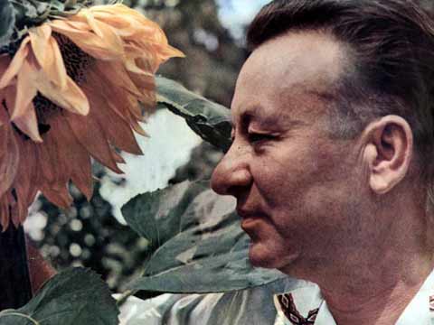 За роман╕вським небом - син╕ причали, За роман╕вським полем - гуси кричали. Поп╕д хати слалася м’ята чиста, Та ще грала музика урочиста. Серед темно╖ ноч╕ б╕ля Рильського хати "Рушничка" нам на трубах почали вигравати; ╤ сп╕вали соняхи, й н╕чка запала: - Р╕дна мати моя, Ти ночей не доспала! ╤ лет╕в б╕ля матер╕ голуб сивий, ╤ сид╕в Максим Рильський, як завжди, - красивий... 1964 р.