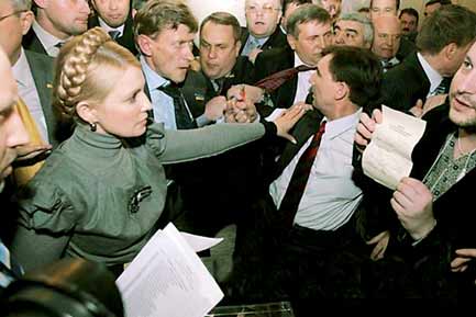 У ПАРЛАМЕНТ╤ ПРОДОВЖУЮТЬ Д╤ЛИТИ КОМ╤ТЕТИ ╤ В╤ЦЕ-СП╤КЕРСЬК╤ ПОСТИ 11 грудня Президент Укра╖ни В╕ктор Ющенко вн╕с на розгляд Верховно╖ Ради VI скликання кандидатуру Юл╕╖ Тимошенко на посаду Прем’╓р-м╕н╕стра. В╕дпов╕дну пропозиц╕ю в╕н оголосив з трибуни парламенту. Однак л╕дера БЮТ на пленарному зас╕данн╕ Верховно╖ Ради не було обрано Прем’╓р-м╕н╕стром. За п╕дтримку ╖╖ кандидатури проголосувало 225 депутат╕в при необх╕дному м╕н╕мум╕ в 226. Тобто, коал╕ц╕я, яка нарахову╓ 227 ос╕б, не проголосувала у повному склад╕. Народний депутат Олександр Турчинов - соратник Тимошенко - заявив, що в одного з народних депутат╕в з техн╕чних причин не спрацювала картка для голосування. Сп╕кер Арсен╕й Яценюк вин╕с питання про повторне голосування за призначення Юл╕╖ Тимошенко Прем’╓р-м╕н╕стром. Проте ╕ за це проголосувало лише 225 ос╕б. При цьому не спрацювали картки вже у трьох депутат╕в в╕д коал╕ц╕╖, як╕ стверджували, що натискували кнопку "за". У зв’язку з цим було сформовано м╕жв╕домчу ком╕с╕ю у склад╕ прац╕вник╕в СБУ, ╤нституту проблем математичних машин ╕ систем Нац╕онально╖ Академ╕╖ наук Укра╖ни, апарату Верховно╖ Ради. "Ми ма╓мо серйозну проблему з системою для голосування, яка дос╕ не сертиф╕кована на предмет сво╓╖ захищеност╕", - заявив представник НУ-НС Роман Зварич. За його словами, п╕д сумн╕в можна поставити будь-який результат голосування за допомогою ц╕╓╖ системи. 12 грудня Президент Укра╖ни В╕ктор Ющенко повторно вн╕с до Верховно╖ Ради Укра╖ни VI скликання подання про призначення Юл╕╖ Тимошенко на посаду Прем’╓р-м╕н╕стра Укра╖ни, але через блокування трибуни та зруйнування рег╕оналами робочого м╕сця Голови ВР голосування так ╕ не в╕дбулося. ╤з самого ранку 13 грудня представники фракц╕╖ Парт╕╖ рег╕он╕в продовжили блокувати трибуну ╕ презид╕ю в сес╕йному зал╕. Парт╕я рег╕он╕в поставила вимогу: повернутися до статт╕ 16 Регламенту ВР, сформувати ком╕тети та обрати в╕це-сп╕кер╕в парламенту, а з ц╕╓ю метою провести консультац╕╖ та зас╕дання Погоджувально╖ ради. ╤ лише п╕сля цього провести пленарне зас╕дання ВР. Представник БЮТ Олександр Турчинов назвав те, що в╕дбува╓ться в парламент╕, "агон╕╓ю уряду Януковича", яка переходить в небезпечну для кра╖ни стад╕ю. У "Наш╕й Укра╖н╕ - Народн╕й самооборон╕" п╕дтвердили, що р╕шення про п╕дтримку кандидатури Юл╕╖ Тимошенко на посаду Прем’╓ра залиша╓ться незм╕нним. 13 грудня веч╕рн╓ зас╕дання парламенту тривало всього к╕лька хвилин. Голова Верховно╖ Ради Арсен╕й Яценюк пов╕домив, що до цього часу не вир╕шен╕ питання щодо кандидатур заступник╕в голови Верховно╖ Ради ╕ розпод╕лу парламентських ком╕тет╕в. Тому зас╕дання Погоджувально╖ ради л╕дер╕в фракц╕й продовжувалося...