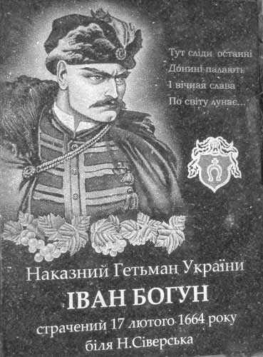 Жалобний день... 17 (27) лютого мина╓ 344 роки в╕д дня страти за Укра╖ну найвидатн╕шого ЛИЦАРЯ КОЗАЧЧИНИ, СИМВОЛУ ПРАВДИ в наш╕й ╕стор╕╖, найулюблен╕шого героя Тараса Шевченка ╕ всього укра╖нського народу - ╤вана БОГУНА. ╤ван БОГУН - р╕к народження нев╕домий, в╕нницький полковник, наказний Гетьман Укра╖ни, який у 1651 р. вразив св╕т сво╖м геро╖змом, вив╕вши в час бою п╕д Берестечком б╕льш╕сть козацьких в╕йськ з облоги. Протягом 15 рок╕в не випускав з рук пернача - очолював багато переможних визначальних бо╖в. Завжди, де був Богун, там була перемога - козаки йому в╕рили, його любили, за ним ╕шли. ╤ван Богун був вражаюче талановитим во╖ном-стратегом, далекоглядним пол╕тиком, людиною-символом багатьох чеснот - християнином з вражаючою ╕нту╖ц╕╓ю ╕ пророчим в╕дчуттям. Природа над╕лила ╤вана Богуна винятковою красою обличчя, статури, глибиною розуму ╕ крицевою силою вол╕. ╤вана Богуна знав ╕ ц╕нував св╕т - про що св╕дчить л╕тература р╕зними мовами св╕ту. Так, зокрема польський критик ╤. Ролл╓ писав, що "з 80-ти д╕яч╕в Хмельниччини ╤ван Богун найпрекрасн╕ший - по╓днаний розум, в╕йськов╕ зд╕бност╕, не заплямував себе жорсток╕стю, в╕дзначився високою моральн╕стю ╕ в╕рн╕стю високим ╕деалам". ╤ван Богун не т╕льки не п╕шов у Переяслав з╕ сво╖м полком, не п╕дписав ганебно╖ угоди про п╕дданство рос╕йському царев╕, але в╕двертав ╕нших пров╕дних во╖н╕в, переконував гетьмана про загрозу такого вчинку для майбуття Укра╖ни.
