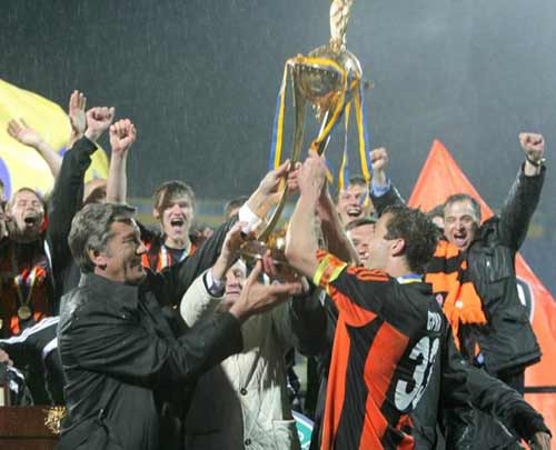 7 травня футбол╕сти донецького «Шахтаря» стали володарями Кубка Укра╖ни сезону 2007-2008 рр. У ф╕нальному по╓динку на стад╕он╕ «Метал╕ст» у Харков╕ «г╕рники» виграли у ки╖вського «Динамо» - 2:0. Почесний трофей переможцям вручив Президент Укра╖ни В╕ктор Ющенко, пов╕домля╓ УКР╤НФОРМ. Рахунок на 44-й хвилин╕ зустр╕ч╕ в╕дкрив Олександр Гладкий. Форвард «помаранчево-чорних» скористався в╕дм╕нним пасом ╤лс╕ньйо й одним дотиком переправив м’яч у с╕тку вор╕т Олександра Шовковського. Остаточну крапку у матч╕ на 78-й хвилин╕ поставив Олекс╕й Гай, який сильно пробив з 17 метр╕в. Кияни у свою чергу не реал╕зували чимало гольових момент╕в. Очевидно, сьогодн╕ був не динам╕вський день. Арб╕тр по╓динку одесит В╕ктор Швецов показав п’ять червоних карток. На 62-й хвилин╕ за грубу гру проти хавбека киян Карлоса Корреа з поля був вилучений Брандау, на 72-й хвилин╕ червоне св╕тло загор╕лося перед динам╕вським захисником Папе Д╕акате, який намагався через себе вибити м’яч, але поц╕лив у голову ╤горя Дуляя, наприк╕нц╕ гри за б╕йку завчасно до роздягальн╕ п╕шли Володимир ╢зерський та ╤смаель Бангура, а пот╕м (за друге попередження) - ╕ Олександр Гладкий. «Шахтар»: Андр╕й П’ятов, Дар╕о Срна, Дмитро Чигринський, Олександр Кучер (Володимир ╢зерський (46), Разван Рац, Фернанд╕ньйо, ╤лс╕ньйо, Томаш Хюбшман, ╤гор Дуляй (Олекс╕й Гай, 74), Брандау, Олександр Гладкий. «Динамо»: Олександр Шовковський, Папе Д╕акате, Т╕бер╕у Г╕оане, Карлос Корреа, Олександр Ал╕╓в (Артем М╕левський, 81), Артем Кравець, В╕тал╕й Мандзюк, Бадр Ель Каддур╕, Ай╖ла Юссуф, ╤смаель Бангура, Мар’ян Маркович (М╕лош Н╕нкович, 46).