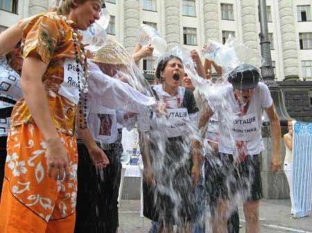 Молод╕жна орган╕зац╕я «Демократичний Альянс» оголосила про початок загальноукра╖нсько╖ молод╕жно╖ протестно╖ кампан╕╖ «Театр пол╕тично╖ драми», у межах яко╖ до к╕нця року орган╕зац╕я проведе 50 театрал╕зованих вистав на площах великих м╕ст Укра╖ни. Про це на прес-конференц╕╖ в УКР╤НФОРМ╕ пов╕домив голова «Демократичного Альянсу» Василь Гацько. За його словами, в центр╕ уваги кампан╕╖ - безв╕дпов╕дальн╕сть укра╖нських пол╕тик╕в у питаннях забезпечення безкризового розвитку нашо╖ держави. «Безв╕дпов╕дальн╕сть укра╖нського пол╕тика, яку ми назива╓мо патолог╕╓ю, сьогодн╕ пронизала вс╕ сфери функц╕онування держави. ╤ саме тому в наших акц╕ях ми наголошу╓мо на ╖╖ проявах у р╕зних галузях пол╕тичного, соц╕ального та економ╕чного життя кра╖ни», - зазначив В. Гацько. На його думку, кампан╕я «Театр пол╕тично╖ драми» д╕ятиме як певний вид психотерап╕╖, що згодом матиме л╕кувальний ефект. «Ми хочемо за допомогою наших вистав викликати дискус╕ю в сусп╕льств╕ ╕ здорове обурення сусп╕льства на безв╕дпов╕дальн╕ д╕╖ пол╕тик╕в р╕зних «кольор╕в», - додав в╕н. 13 серпня б╕ля ст╕н Каб╕нету м╕н╕стр╕в Укра╖ни Всеукра╖нська молод╕жна громадська орган╕зац╕я «Демократичний Альянс» провела театрал╕зовану виставу «П╤ДМОЧЕНА РЕПУТАЦ╤Я» (на фото вгор╕). Молодь ╕з р╕зних рег╕он╕в кра╖ни наголосила на безв╕дпов╕дальност╕ укра╖нських пол╕тик╕в у питанн╕ запоб╕ганню еколог╕чним катастрофам. У головн╕й рол╕ вистави репутац╕╖ в╕тчизняних пол╕тик╕в та ╖хн╕ господар╕, народ та справедлив╕сть. Ф╕нал акц╕╖ – п╕дмочен╕ репутац╕╖ та заклик пол╕тикам служити народу Укра╖ни. «Укра╖нськ╕ пол╕тики позбавлен╕ в╕дчуття в╕дпов╕дальност╕ за цю кра╖ну. Вони зд╕йснюють попул╕стську пол╕тику, яка нездатна забезпечити безкризовий розвиток нашо╖ держави», - говорить голова Демократичного Альянсу Василь Гацько. На думку л╕дера молод╕жного об’╓днання: «Дозволене пол╕тиками нерац╕ональне використання природних ресурс╕в, в╕дсутн╕сть з боку високопосадовц╕в належно╖ уваги еколог╕чн╕й безпец╕ кра╖ни, зробило можливим так╕ масштаби ╕ так╕ насл╕дки повен╕». «Укра╖нське сусп╕льство ма╓ змусити пол╕тик╕в створити прост╕р безпеки на теренах держави ╕ м╕н╕м╕зувати вс╕ляк╕ загрози людському життю», - додав в╕н.