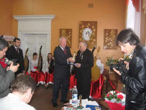 ВРУЧЕННЯ «СТЕПОВОГО ОРЛА» Вручення Володимиру Михайловичу золото╖ статуетки «Степовий орел» в╕дбулося в урочист╕й, тепл╕й атмосфер╕. Були присутн╕ представники творчо╖ ╕нтел╕генц╕╖, ╕ в усьому в╕дчувалося, що вони – на його боц╕, тобто роль Караташа в укра╖нськ╕й ╕стор╕╖ усв╕домлюють, а нагороду схвалюють. Вручав «Степового орла» голова К╕ровоградсько╖ обласно╖ Ради Микола Сухомлин. Про колишнього пол╕тв’язня в╕н говорив тепло ╕ щиро. Учасник Кенг╕рського повстання на це, д╕йсно, заслугову╓. Адже був засуджений до розстр╕лу, довгих п’ять м╕сяц╕в пров╕в у камер╕ смертник╕в, з яко╖ в╕с╕м раз╕в виводили на ╕м╕тований розстр╕л. Але Караташ не зламався. До реч╕, вперше до розстр╕лу його засудили ще н╕мц╕. Але ╖м не вдалося його уп╕ймати, тому розстр╕ляли т╕льки батька. Як ╕ батько, Володимир Караташ виявився б незручним для будь-якого тотал╕тарного режиму. Ага, забув ще сказати, в УПА Караташ мав псевдо «Глек». Звучить не дуже геро╖чно, правда? Йому б╕льше пасувало б псевдо «Орел». Але, з ╕ншого боку… Якщо таким був «Глек», то якими ж були «Гонти», «Зал╕зняки», «Довбуш╕», «Богуни»? Раз уже я згадав Богуна, то зазначу, що Володимир Михайлович Караташ активно вою╓ за перейменування К╕ровограда… у м╕сто Богун. Або ж Богунськ. Уявля╓те, як гарно звучатиме – Богунська область! Це сприятиме нац╕ональному в╕дродженню краю, бо назва також створю╓ певну ауру… Причому, це впливатиме на лише на м╕сцевих, але й на б╕льш╕сть громадян Укра╖ни. Скаж╕мо, у Запор╕зьк╕й област╕ дуже мало ╓ укра╖нського, х╕ба що назва звучить геро╖чно. Але без ц╕╓╖ назви ╕ кияни, ╕ льв╕в’яни, ╕ волиняни були б дещо ╕ншими. Тому ╕дея Караташа дуже ц╕кава, от т╕льки реал╕зувати ╖╖ буде непросто. Але для само╖ ╕де╖ дуже добре, що пропагу╓ ╖╖ стр╕лець «Глек» ╕з сотн╕ «Сталевого», яка входила до УПА-«П╕вдень». ╤ не просто стр╕лець, а людина, яка на схил╕ л╕т отримала з рук Президента заслужену нагороду – Орден Мужност╕.