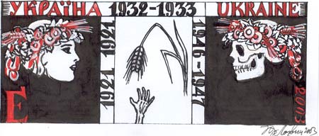 Надсилаю вам два ескізи можливої марки про Голод. Про голод-33 мені муляло від раннього дитинства, коли почув про канібалізм у розмові своїх бабусь десь узимку 44 - 45 років. 66-го року зробив гравюру на дереві про голод... 1230 року за "Повним зібранням руських літописів". А щоб ніхто не чіплявся, то й вирізав на гравюрі слова з літопису: "І пристави мужа блага і смиренна возиті мертвеца". Але всі, кому було треба, розуміли про що мова. Дивна річ, але тоді ніхто мене не заклав і мене за цю гравюру "не проробляли". І от коли 12 лютого слухав трансляцію з Верховної Ради, то вирішив, що треба таки й марку зробити про те страхіття. Зробив. Почав показувати. І всі злякались - ну хіба можна про таке відверто говорити?! Юрій ЛОГВИН.