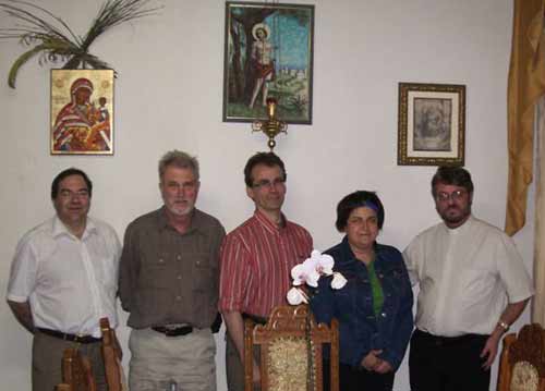 На фото: група досл╕дник╕в в оф╕с╕ Укра╖нсько╖ Автокефально╖ Православно╖ Церкви в П╕вденн╕й Америц╕, Кур╕т╕ба (зл╕ва – направо): Серг╕й Ц╕пко, Джон Лер, Андр╕й Нагачевський ╕ Марина Гримич, разом ╕з Його преосв. ╢рем╕╓ю Ференсом, арх╕╓пископом УАПЦ у П╕вденн╕й Америц╕.