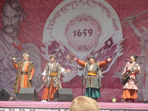 У пам’ять про славну козацьку перемогу в сел╕ Шаповал╕вка, що п╕д Конотопом, щороку в╕дбува╓ться святкування та всеукра╖нський фестиваль «Козацький родослав». У день 350-р╕ччя ц╕╓╖ перемоги було в╕дкрито пам’ятний знак при в’╖зд╕ в село Шаповал╕вку. Святков╕ заходи в╕дбувалися 10-12 липня. Цьогор╕ч в╕д греко-католицько╖ церкви святого Йосафата м╕ста Червонограда Льв╕всько╖ област╕ ви╖хав автобус ╕з козаками «Зах╕дно-Бузького Куреня Прикарпатсько╖ С╕ч╕ Укра╖нського Козацтва», козаками Льв╕вського товариства «С╕ч» та прихожанами п╕д кер╕вництвом отця Володимира, настоятеля греко-католицько╖ церкви Благов╕щення Пресвято╖ Богородиц╕ у Великих Мосмах. Коли ми подолали шлях б╕льш н╕ж 700 к╕лометр╕в, автобус зустр╕ли хл╕бом ╕ с╕ллю представники Сумсько╖ ОДА. На мальовничих берегах озера при в’╖зд╕ у Шаповал╕вку таборами були розбит╕ козацьк╕ шатра та шатра ВО «Свобода». Козаки прибували ╕з ус╕ма необх╕дними в╕дзнаками, прапорами та ╕ншою атрибутикою. Були нав╕ть гармати. Комендант табору гостинно запросив подорожн╕х до справжньо╖ козацько╖ кулеш╕. П╕сля сн╕данку проведено козацьке коло, на якому в╕дзначена ╕сторична перемога, ╕ отаман козацького товариства «С╕ч» Андр╕й Коляса з╕ Львова запропонував об’╓днати зусилля для розбудови Укра╖ни. Пом╕чник секретаря Ради Укра╖нського козацтва А. Грива пов╕домив козакам про необх╕дн╕сть надання допомоги м╕л╕ц╕╖ в охорон╕ громадського порядку. В╕дкриття пам’ятного знаку на честь Перемоги у Конотопськ╕й битв╕ 1659 року в╕дбувалося в присутност╕ Верховного гетьмана Укра╖ни, Президента Укра╖ни В╕ктора Ющенка. Урочиста хода козак╕в п╕д бойовими прапорами викликала захоплення м╕сцевих жител╕в та гостей фестивалю ╕ зак╕нчилася б╕ля в╕дкритого у цей святковий день погруддя ╤вана Виговського, який з╕ сво╖м в╕йськом та татарськими ╕ польськими союзниками прийшов на допомогу обложеному москов╕тами Конотопу ╕ розгромив в╕йсько нападник╕в, що складалося ╕з багатьох десятк╕в тисяч в╕дб╕рних дворянських к╕ннотник╕в. У день ц╕╓╖ перемоги кожен житель Шаповал╕вки вив╕шу╓ на ворота вишиваний рушник. Президентський оркестр заграв марш. П╕сенний фестиваль в╕дкрив Президент Укра╖ни, який у сво╖й промов╕ нагадав под╕╖ сиво╖ давнини та ╖хн╓ значення в наш╕й ╕стор╕╖. ╤ залунали п╕сн╕. Справжн╕ козацьк╕ п╕сн╕. К╕нноспортивна група демонструвала неймов╕рн╕ трюки, майстри козацького двобою показали надзвичайно складн╕ вправи. А курен╕в р╕зноман╕тних – б╕льше сотн╕. Нав╕ть «Укрпошта» зд╕йснювала спецпогашення юв╕лейного конверта юв╕лейною печаткою. ╤ не зустр╕неш на Вкра╖н╕ вид╕в народно╖ творчост╕, яких не було б представлено на ярмарку. А козацьк╕ гармати салютували козацьк╕й слав╕. Забав для д╕тей ╕ стол╕в для дорослих перел╕чувати не будемо. Розваг було наст╕льки багато (а в козацьких старшин ще ╕ друге коло – за п╕дсумками), що нав╕ть отець Володимир погодився перенести ви╖зд ╕з 17-╖ на 19-ту годину. Через п╕вгодини ми були вже в гетьманськ╕й столиц╕ – Батурин╕. Прикро, що музе╖ там працюють лише до 17.00. Проте ми все-таки подивилися ╕ пас╕ку Прокоповича – винах╕дника рамки у вулику, ╕ фортецю, ╕ нав╕ть за мур заглянули. Московити цю фортецю н╕коли б не взяли, якби зрадник не пров╕в 