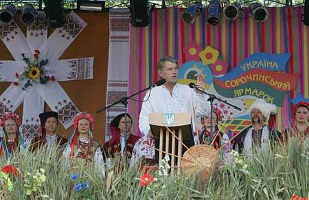 Нац╕ональний Сорочинський ярмарок – найб╕льш масовий ╕ популярний в Укра╖н╕ торг з елементами народного карнавального д╕йства – розпочався 19 серпня у сел╕ Велик╕ Сорочинц╕ Миргородського району Полтавсько╖ област╕. Цього року в╕н в╕дбува╓ться в рамках в╕дзначення 200-р╕ччя в╕д дня народження Миколи Гоголя, який уславив його на весь св╕т сво╖м ген╕альним пером в однойменному твор╕, переда╓ кореспондент УКР╤НФОРМу. Президент Укра╖ни В╕ктор Ющенко взяв участь у в╕дкритт╕ Нац╕онального Сорочинського ярмарку. У сво╓му в╕тальному слов╕ Глава держави наголосив, що Сорочинський ярмарок став справжн╕м нац╕ональним святом, яке яскраво представля╓ творч╕сть народних майстр╕в. «Ми сюди ╖демо, щоб показати, що ми – укра╖нц╕, що ми в╕дтворю╓мо свою пам’ять. Ми – укра╖нц╕, у нас ╓ незалежна держава, обов’язково вона буде процв╕таючою, демократичною ╕ в╕чною», – сказав в╕н. Президент нагадав, що Сорочинський ярмарок, уславлений у творчост╕ Миколи Гоголя, припинив ╕снування у 1920-х роках, нин╕ ж в╕дновлений як елемент нац╕онально╖ традиц╕╖. «Сорочинський ярмарок – це демонстрац╕я наших можливостей», – сказав Президент, наголосивши, що «головний прилавок – це с╕льськогосподарський». За словами В╕ктора Ющенка, за останн╕ 5-6 рок╕в Укра╖на серйозно посилила потенц╕ал аграрно╖ промисловост╕, яка традиц╕йно утверджувала ╖╖ на м╕жнародних ринках. Так, за результатами минулор╕чного сезону Укра╖на знаходиться серед л╕дер╕в св╕тового зернового експорту – вона перша у св╕т╕ за обсягами експорту ячменю, шоста – серед найб╕льших експортер╕в пшениц╕, четверта – серед експортер╕в кукурудзи. Тож, незважаючи на економ╕чну кризу, участь у ярмарку бере значна к╕льк╕сть промислових ╕ с╕льськогосподарських п╕дпри╓мств з р╕зних рег╕он╕в Укра╖ни та з-за кордону. За даними орган╕затор╕в ярмарку, нин╕ ╖х нав╕ть б╕льше, н╕ж тор╕к – к╕лька сотень. При цьому, в ход╕ роботи ярмарку до учасник╕в, що вже прибули сюди додасться ╕ чимало ╕нших, як╕ з р╕зних м╕ркувань вир╕шили виставити сво╖ товари на продаж не в перший день, а в наступн╕, коли на багатогектарному Жабокрицькому майдан╕ зберуться сотн╕ тисяч людей. Пом╕тно поб╕льшало на ярмарковому майдан╕ ╕ майстр╕в народних ремесел, веселих тро╖стих музик, як╕ вже зранку створюють ярмаркуючим гарний, безтурботний настр╕й. Глава держави побажав в╕дв╕дувачам цього заходу вдало поярмаркувати. * * * Президент Укра╖ни В╕ктор Ющенко п╕д час сво╓╖ по╖здки на Полтавщину в╕дв╕дав Спасо-Преображенський храм у Великих Сорочинцях Миргородського району, пов╕домля╓ УКР╤НФОРМ ╕з посиланням на прес-службу Глави держави. Спасо-Преображенський храм (УПЦ) у Великих Сорочинцях збудований у 1732 роц╕ за дорученням гетьмана Л╕вобережно╖ Укра╖ни Данила Апостола. Його площа становить 278 кв. м. У 1954 роц╕ в╕д грозового розряду храм згор╕в, ремонт його не проводився, ╕ в 1959 роц╕ храм було закрито як авар╕йний, а в 1962 роц╕ – знято з ре╓страц╕╖. Храм ╓ одним з найц╕кав╕ших зразк╕в арх╕тектури Л╕вобережно╖ Укра╖ни початку XVIII стол╕ття. У ньому збер╕гся великий дерев’яний ╕коностас, у якому близько 100 ╕кон високо╖ художньо╖ ц╕нност╕. У Преображенськ╕й церкв╕ охрещений Микола Гоголь, про що встановлено мемор╕альну дошку б╕ля центрального вход
