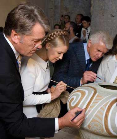 На фото: В╕ктор Ющенко, Юл╕я Тимошенко ╕ Володимир Литвин у «Мистецькому Арсенал╕»...