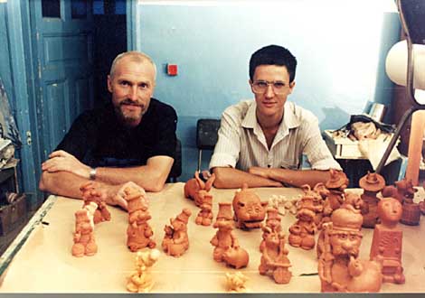 Квітне талантами земля українська. Навіть тепер, на похмурому тлі політичного безладу і матеріальної скрути. Відсутність гармонії в суспільстві породжує озлоблення і зневіру. Та є інша гармонія. Це - народне мистецтво. Воно прекрасне і вічне. Допоки світить на небі Сонце. Кожен народ творить своє мистецтво. Воно багатолике і неповторне. Україна здавна славилася своїми майстрами. Не позичати талантів нам і зараз. У всіх куточках нашої вітчизни народні умільці вишивають узори, ліплять із глини, вирізьблюють із дерева, розписують, тчуть, в'яжуть, плетуть, викликаючи подив і захоплення творіннями своїх рук. Уже дванадцять років у Криму розвивають свою творчу майстерність народні митці, які створили Кримський республіканський осередок Національної Спілки майстрів народного мистецтва України. Вони різні за віком і за фахом, але єдині за своїм нестримним потягом до художньої творчості. Кримська земля напрочуд мальовнича і дивовижна. Красуня, перед якою падають на коліна... Вона возвеличена пером поета і пензлем живописця. Тож не дивно, що саме тут і зародився творчий колектив народних майстрів. Очолює його талановитий заслужений художник Криму Іван Григорович Галичин. Заворожений красою древньої Тавриди, він малює і малює її пейзажі - блакитне море, покриті смарагдовими лісами гори. Родом із Полтавщини, Іван Григорович раз у раз звертається у своїй творчості до постатей Лесі Українки, Тараса Шевченка та створених ними літературних образів. Є в нас і свій корифей - заслужений народний майстер України Микола Вакуленко (на фото - ліворуч), художні вироби якого відомі далеко за межами нашої країни. У творчому доробку майстра численні керамічні фігурки козаків, дідусів і бабусь та всіляких тварин. Його герої щедро наділені національним гумором. Безжурні чубаті козаки з добрими очима і загубленою в густих вусах хитрою посмішкою... А який же козак без люльки і доброї чарки! Та й попрацювати інколи не гріх. Не менш симпатичні і тварини. Ось корова, по-жіночому приваблива, кудись собі чимчикує з глечиком молока... А товстелезний кіт несе величезну рибину - чи то сам упіймав здобич, чи вкрав у довірливого господаря - не нам судити. Усі ці герої живуть собі не тужать у художній майстерні пана Миколи і нема їм ніякого діла до того, що діється довкола. Глянеш на ці кумедні фігурки і сам повеселішаєш. Ось він, секрет майстра, - пройняти душу, заставити посміхнутися, хочеш ти цього чи не хочеш. Микола Вакуленко не ховає свій талант у кишеню. Він охоче ділиться творчим досвідом із молодими. Два рази на тиждень майстер безкоштовно займається ліпленням із глини з дітьми різного віку, плекає юні таланти. Є учні зі школи М. Вакуленка, які тісно пов'язали своє подальше життя з керамікою. Серед них Борис Космач (на фото - праворуч), який сягнув належного рівня у своїй творчості. На перший погляд здається, що він наслідує свого вчителя, але це не зовсім так. За тематикою - це ті самі образи, що й у М. Вакуленка, але в їх виконанні неважко помітити власний творчий почерк автора. Чільне місце в кераміці Бориса Космача посідають герої з українського фольклору -козаки-веселуни, що полюбляють оповідати цікаві бувальщини, курити люльку і пити горілку, аж поки не почнуть ввижатися на дні чарки вреднющі чортенята. Як у Гоголя. А от у Валентини Матієнко глиняний "народ" у чарку не 