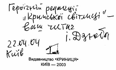 У давнього приятеля "Кримської світлиці" академіка Івана Михайловича Дзюби у видавництві "Криниця" вийшла нова книга - "Пастка. Тридцять років зі Сталіним. П'ятдесят років без Сталіна". Проблеми, які розглядає у цій роботі відомий публіцист, літературознавець, громадський діяч, - говориться в анотації, - не відійшли із нашого суспільного буття, не відгоріли, не відболіли в душах українців... Примірник щойно виданої книги Іван Михайлович відразу ж надіслав до редакції "Світлиці" - з лаконічним, але таким значущим для нас, "світличан", автографом (нам навіть після Президентського доручення стосовно долі газети не було на душі так крилато!). Кланяємося Вам, шановний Іване Михайловичу, за книгу, за підтримку, за те, що Ви - зі "Світлицею"!