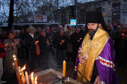 27 листопада у С╕мферопол╕ б╕ля ст╕н храму св. Володимира та Ольги представники укра╖нсько╖ громади Криму запалили св╕чки пам’ят╕ жертв Голодомору. ╢пископ С╕мферопольський ╕ Кримський Климент УПЦ КП в╕дслужив панахиду за безневинно загиблими у т╕ траг╕чн╕ страшн╕ роки. Виступаюч╕, серед яких були й т╕, кому судилося пережити Голодомор, закликали не допустити замовчування ╕ згортання пам’ят╕ про цю траг╕чну стор╕нку в наш╕й ╕стор╕╖, яку намагаються переписати ╕дейн╕ нащадки тих, хто орган╕зовував в Укра╖н╕ цей геноцид... Фото О. Носаненка.