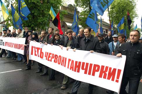 Банкова обрала Маркова... Отже, наприк╕нц╕ кв╕тня сусп╕льство зам╕сть того, щоб говорити про результати реформ ново╖ влади, стало говорити про червоний прапор. Дискус╕я забезпечувалася на найвищому р╕вн╕. Телеканал голови СБУ Валер╕я Хорошковського, який став його особистим в╕дд╕лом аг╕тац╕╖ ╕ пропаганди, присвятив цьому один з сво╖х еф╕р╕в. В аг╕тпроп╕ ново╖ влади та Хорошковського особисто ходить рос╕йський телеведучий ╢вген Кисельов. Подейкують, що варт╕сть роботи головного телеведучого телеканалу «╤нтер» - 50 тисяч долар╕в на м╕сяць. Його платня могла б нас не хвилювати, якби результатом ╖╖ роботи не було посилення розколу в укра╖нському сусп╕льств╕. У Кисельова на одному з останн╕х в кв╕тн╕ еф╕р╕в «╤нтеру» укра╖нському сусп╕льству представили одеського депутата ╤горя Маркова. Це один з безпосередн╕х реал╕затор╕в Льв╕всько╖ провокац╕╖. За час╕в Луценка проти Маркова порушувалася крим╕нальна справа за зл╕сне хул╕ганство. ╤нтернет ряб╕╓ новинами ╕ в╕део╕нформац╕╓ю про те, як славний одеський депутат, «авторитетний п╕дпри╓мець» щось укотре захопив, когось поранив. На таких от людей вимушен╕ спиратися кремл╕всько-банк╕вськ╕ штаб╕сти. ╢ нав╕ть сюжети з його нецнотливим життям. Отака ╓ у представник╕в Рос╕йсько╖ Федерац╕╖ одеська парт╕я «Родина». Саме це парт╕я забезпечила мед╕а-супров╕д кримсько╖ ╕ одесько╖ делегац╕╖. Окр╕м, зрозум╕ло, кримсько╖ парт╕╖ «Русское единство». Ц╕ люди безпосередньо мали вчинити провокац╕ю у Львов╕. По╖здку до Львова. ╤ п╕д виглядом покладання кв╕т╕в стати м╕шенню ╕ причиною для колотнеч╕ з «Свободою».