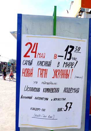 Про те, що у Севастопол╕ вперше виконуватиметься «найкращий у св╕т╕ г╕мн», я дов╕дався з оголошення на автобусн╕й зупинц╕. Кинувши вс╕ справи, я в╕дв╕дав цю под╕ю. Поки наповнювалась глядацька зала, я посп╕лкувався ╕з автором Олександром Петровичем Павловським. У розмов╕ виявилось, що в╕н «мучиться цим» (в╕ршуванням) ╕з студентських рок╕в, а «ген╕альний» г╕мн (який кращий нав╕ть за г╕мн Сов╓тського Союзу) написав, тому що йому «набридла та п╕сенька написана 1834 року» «якимось поп╕ком». ╤ додав: «три област╕ мутять всю Укра╖ну, оця Галичина». «Щоб не гавкали бандер╕вц╕» ╕ поки г╕мн ще не затвердила Верховна Рада, в╕н назвав тв╕р «Г╕мн Укра╖н╕». Зрозум╕вши, що це ╕нтерв’ю, в╕н ╕з рад╕стю розкрив всю свою ненависть до Укра╖ни, подарував аркуш з текстом, де були пом╕чен╕ наголоси. Говорив про як╕сь 50 тисяч долар╕в, як╕ йому пропонували за ц╕ слова «творч╕ люди з Москви». На початку року в╕н звернувся до директора школи з музично-хоровим ухилом №57 з пропозиц╕╓ю виконати цей тв╕р. Як пот╕м пов╕домила Галина Павл╕вна Гузанова, «гарних п╕сень мало», тому вони з рад╕стю взялись за роботу. У тому, що це маячня графомана, може переконатись будь-яка неупереджена людина. Нерозум╕ння ╕снування в укра╖нськ╕й мов╕ кличного в╕дм╕нку, дикунська пунктуац╕я, неузгоджен╕сть в╕дм╕нк╕в, римування сл╕в з р╕зними суф╕ксами та к╕лька раз╕в повторене у присп╕в╕ «В╕тчизна р╕дна – наша мати, Тебе ми любим безсумл╕нно» спроможне довести до ╕стерики чи до брому будь-якого ф╕лолога. Як визнала директор школи, л╕нгв╕стичного анал╕зу тексту вони не робили, бо «╤спанська корол╕вська академ╕я всесв╕тньо╖ л╕тератури та мистецтва» («п╕сля академ╕╖ неетично»), за словами Павловського (!), вже засв╕дчила його перевагу серед 250 (?) п╕сень. Не стану оц╕нювати як╕сть ╕ походження фонограми, я не музикант, але ╓ п╕дозра, що й тут не об╕йшлось без сурогату. Близько п╕всотн╕ д╕тей п╕д диригуванням музичного прац╕вника урочисто виконали, а б╕льше сотн╕ глядач╕в проковтнули цю н╕сен╕тницю. Адже слово «сумл╕ння» означа╓ «сов╕сть». Любити безсумл╕нно – це, вочевидь, любити безсов╕сно. Урочисто ╕ з пафосом просп╕вана н╕сен╕тниця залиша╓ться н╕сен╕тницею. Директор школи №57 пооб╕цяла продовжити вдосконалити виконання цього твору, так ╕ не усв╕домивши, що дов╕ряти пройдисв╕там, як╕ шукають сумн╕вно╖ слави, не сл╕д. Висновок з ц╕╓╖ глупоти м╕сцевого масштабу може бути один – сфера осв╕ти в Севастопол╕ деграду╓ через втручання в не╖ як пол╕тичних сил, громадських ╕ рел╕г╕йних орган╕зац╕й, що прямо заборонено «Законом про осв╕ту» у статт╕ 8, так ╕ потерпа╓ в╕д безперешкодно╖ активност╕ графоман╕в-шов╕н╕ст╕в.