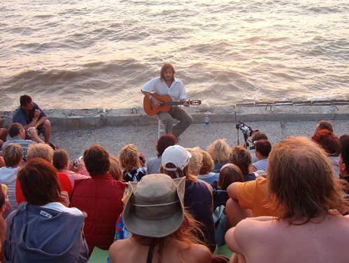 У Севастопол╕ з 1 до 7 серпня проходив фестиваль авторсько╖ п╕сн╕ «Балаклавськ╕ кан╕кули». Я не ╓ фанатичним прихильником авторсько╖ п╕сн╕, але до будь-яко╖ творчост╕ ставлюся з великою повагою. 5 серпня у м╕ському Будинку культури та дозв╕лля у рамках вищеназваного фестивалю мав в╕дбутися веч╕р п╕д назвою «Весела кухня з Борисом Бурдою». В╕домий одесит-╕нтелектуал ма╓ чимало шанувальник╕в, ╕ не лише серед глядач╕в передач╕ «Что, где, когда?». Я також серед них, бо симб╕оз ╕нтелекту та легко╖ весело╖ вдач╕ ц╕ную понад усе. Велика зала Будинку культури була переповнена вщент, городяни та гост╕ м╕ста радо в╕тали Бориса Бурду. Вийшовши на сцену, в╕н передус╕м вибачився за св╕й непрезентабельний, як для ведучого концерту, вигляд – короткуват╕ джинси й вигор╕лу на сонц╕ сорочку: «Якби не ця сорочка з льону, не до╖хав би сюди, помер би в╕д спеки». Байдуж╕ до сцен╕чного дрес-коду севастопольц╕ були у захват╕ в╕д кумира, що розпов╕дав про родзинки кухн╕ р╕зних народ╕в, дивував рецептами страв, орган╕зовував ╕нтелектуальн╕ в╕кторини та дарував переможцям призи. Час в╕д часу в╕н зупинявся, аби представити чергового барда з його гумористичним репертуаром. П╕сенн╕ ╕стор╕╖, вихоплен╕ з виру життя, приправлен╕ тонким гумором, переривалися бурхливими аплодисментами. Перше в╕дд╕лення концерту промайнуло як мить. Не схильний в╕дпочивати за кул╕сами, Борис Бурда сп╕лкувався з городянами у фой╓, роздавав автографи, фотографувався, розпов╕дав, як колись у дитинств╕ опановував музику та сп╕в. Стимули до сп╕ву, як виявилося, були типовими для вс╕х п╕дл╕тк╕в: «…Хот╕лося бути в центр╕ уваги, подобатися д╕вчатам. З раннього дитинства я грав на п╕ан╕но: це була мр╕я мого д╕дуся й мене просто примушували грати. Пам’ятаю, бабуся з д╕дусем ставили на ╕нструмент годинник ╕ казали: «Гратимеш в╕д цього часу до цього». Зрештою, я таки навчився й нав╕ть отримував в╕д цього задоволення, награючи популярн╕ п╕сеньки спочатку для однокласник╕в, пот╕м для друз╕в з п╕онерського табору. Але ж п╕ан╕но не тягатимеш за собою ╕ м╕й товариш Льоня зголосився навчити мене грати на г╕тар╕, буквально за п’ять-ш╕сть урок╕в. Як не дивно, бо сам соб╕ я здаюся ледарем, вже через м╕сяць-другий я опанував ту науку й дуже цим пишався». Веселе сп╕лкування севастопольц╕в з Борисом Бурдою перервав дзв╕нок: глядач╕в запрошували до зали. Друге в╕дд╕лення як дв╕ крапл╕ води було схожим на попередн╓: жарти та ╕нтелектуальн╕ в╕кторини в╕д Бориса Бурди чергувалися з виступами бард╕в з Одеси, Москви, Волгограда, Донецька тощо. Було справд╕ весело, невимушено ╕ я рад╕ла ц╕й знах╕дц╕, маю на уваз╕ сюжет. Так тривало, аж поки на сцену не вийшов бард ╕з Донецька Вадим Гефтер. Спочатку в╕н засп╕вав про злод╕я-домушника, який з усп╕хом крав, допоки не розжир╕в на дармових харчах. В╕дтод╕ для нього настали скрутн╕ часи, бо застряг у в╕дчинен╕й кватирц╕, де його ╕ знайшов господар. Особлив╕стю його виконання було те, що сп╕вав в╕н в╕д першо╖ особи. Друга п╕сня п╕д назвою «Сомал╕йський п╕рат» змусила мене повернутися до думки, що у Севастопол╕ пол╕тикою займаються нав╕ть барди. Треноване журнал╕стське вухо, мабуть, не здатне розслабитися до т╕╓╖ меж╕, аби перестати препарувати текст. Сомал╕йський п╕рат, за творчим 