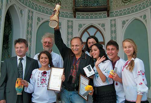 На фото: переможц╕ Всеукра╖нського фестивалю «Золоте курча» юн╕ актори кримсько╖ студ╕╖ «Св╕танок» та ╖хн╕й режисер Олександр Польченко на церемон╕╖ вручення нагород.