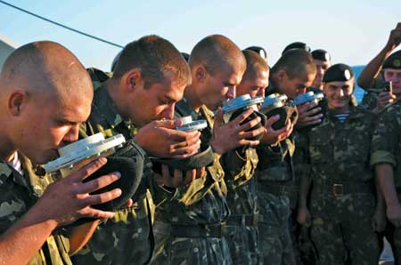 25 вересня на великому десантному корабл╕ «Костянтин Ольшанський», який перебува╓ в морському поход╕ Чорним морем у рамках навчань «Адекватне реагування — 2011», традиц╕йний ритуал «оморячування» пройшло майже 50 в╕йськовослужбовц╕в. У в╕льний м╕ж бойовими навчаннями час в╕йськовослужбовц╕ батальйону морсько╖ п╕хоти, Центру в╕йськ берегово╖ оборони, корабля та деяких ╕нших частин ВМС ЗС Укра╖ни вишикувалися на шкафут╕, взяли в руки 700-грамов╕ плафони з морською водою ╕ п╕д гучн╕ оплески та схвальн╕ вигуки товариш╕в випили ╖х до останньо╖ крапл╕. Командир корабля кап╕тан 2-го рангу В╕ктор Марчишин за морською традиц╕╓ю прив╕тав ус╕х, хто вперше вийшов у море ╕ пройшов морський ритуал, як р╕вних у морському братерств╕. Серед «новачк╕в» – заступник командира батальйону морсько╖ п╕хоти з виховно╖ роботи майор Ростислав Ломт╓в, родом ╕з Микола╓ва, який входить до апарату кер╕вництва п╕д час висадки морського десанту. На контрактника Олександра Каращука з Херсонщини покладаються обов’язки старшого нав╕дника. А призовник весни 2011 року житомирянин Серг╕й Вас╕н – молодий стр╕лець. В╕йськовослужбовц╕ задоволен╕ – адже, незважаючи на певне «випробування», вони отримали справжню «перепустку» в моряки.