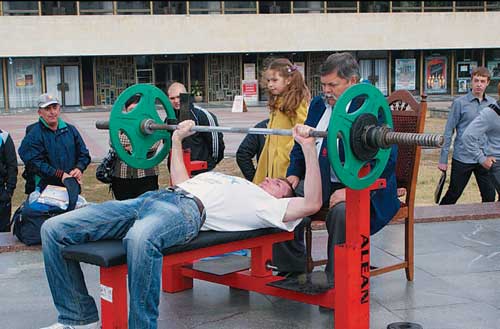 Чомусь так склалося, що реклама цигарок та пива присутня у нашому повсякденному житт╕ буквально скр╕зь. Саме тому й здивували мене тор╕к у Р╕вному, де був у в╕дпустц╕, банери ╕з закликами активно займатися спортом. Хочеться в╕рити, що ╕ нещодавно побачене у центр╕ С╕мферополя так само не стане винятком ╕з правил. 1 жовтня на центральн╕й площ╕ м╕ста близько 11-о╖ години почали збиратися люди. Спочатку серед них були виключно спортсмени, що добре було видно за кремезними статурами, але згодом до м╕сця, де було встановлено ст╕йки з╕ штангами, почали збиратися перехож╕. Як з’ясувалося, тут за п╕дтримки с╕мферопольського м╕ського управл╕ння у справах культури, с╕м’╖, молод╕, спорту та туризму, а також спортивних орган╕зац╕й р╕зних м╕ст Укра╖ни розпочався I Кримський м╕жнародний фестиваль силових вид╕в спорту. В його рамках планувалося провести турн╕р з жиму штанги лежачи, а згодом чемп╕онат Укра╖ни з бод╕б╕лдингу ╕ ф╕тнесу. Спочатку змагання проходили виключно м╕ж досв╕дченими спортсменами, як╕ при╖хали до Криму з р╕зних куточк╕в нашо╖ держави, а вже п╕сля ╖хн╕х виступ╕в кожен бажаючий мав можлив╕сть «погратися ╕з зал╕зом». До того ж був ╕ стимул: переможець отримував не т╕льки ц╕нний подарунок, але й грошовий приз — 500 гривень. П╕сля зак╕нчення д╕йства переможц╕ та учасники одержали грамоти ╕ нагороди. Будемо спод╕ватися, що настане час, коли так╕ акц╕╖ стануть звичною справою, а з екран╕в телев╕зор╕в ╕ у повсякденному житт╕ спорт ╕ здоровий спос╕б життя пропагуватимуться набагато б╕льше, н╕ж алкоголь з цигарками…