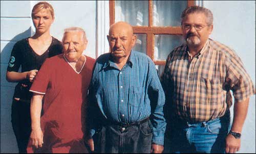 У центр╕ — Олекс╕й Юхимович Чумак, кримський довгожитель; л╕воруч б╕ля нього — дочка Тетяна Олекс╕╖вна Негрова (Чумак), зараз мешканка канадського Ванкувера, праворуч — онук Олександр ╤ванович Негров, ректор Санкт-Петербурзько╖ протестантсько╖ академ╕╖