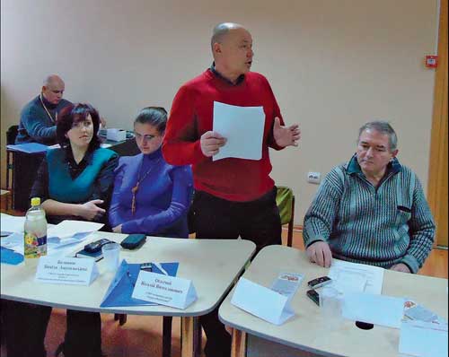 На фото: виступа╓ член м╕сцевого осередку парт╕╖ Укра╖нська платформа «Собор» В╕тал╕й Осадчий (до слова, один ╕з спонсор╕в цьогор╕чного мовно-л╕тературно-╕сторично-п╕сенно-комп’ютерного конкурсу у «Кримськ╕й св╕тлиц╕»)